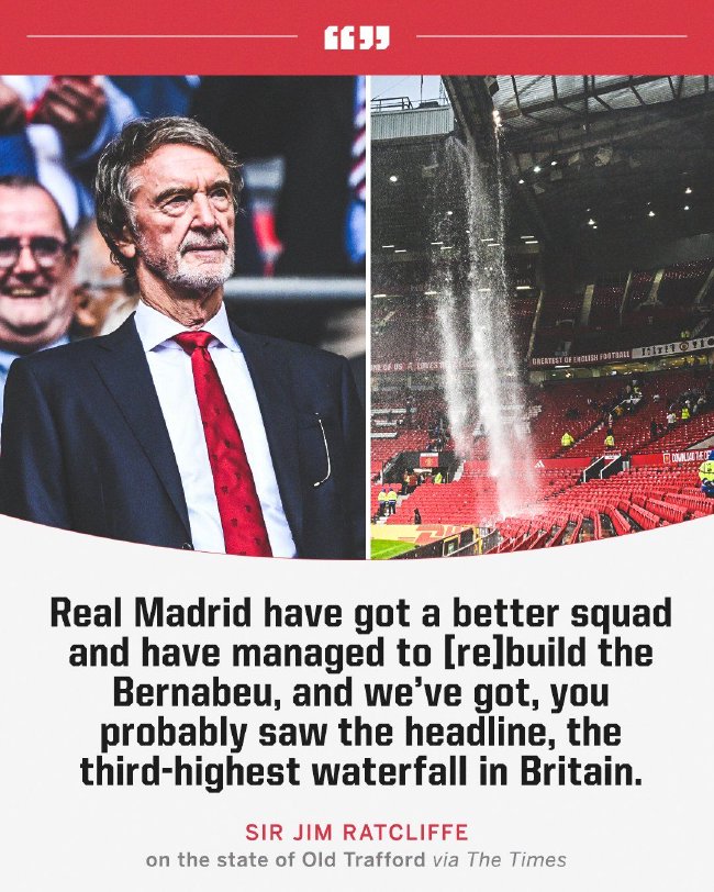 曼联的共同所有人拉特克利夫爵士最近在一次峰会上发表讲话,谈到了皇马的伯纳乌球场和曼联的老特拉福德球场。他称赞皇马用9亿英镑建造的新伯纳乌球场非常壮观,并指出多年来皇马不仅拥有更好的阵容,还成功进行了伯纳乌球场的翻新。相比之下,他提及了曼联所拥有的老特拉福德球场在媒体上曾被描述为“英国第三高的瀑布”。这段时间,老特拉福德球场曾发生过漏雨情况,甚至客队更衣室的天花板也遭受了漏水问题。这些情况可能需要曼联考虑对球场设施进行维护和改进,以提升球迷和运动员的体验。