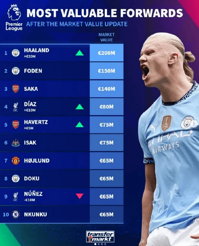 德国转会市场更新了英超球员的最新身价,其中哈兰德以2亿欧元名列榜首,也是英超最值钱的前锋。英超前十大前锋身价排行榜如下: