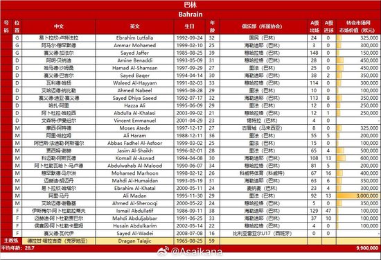 中国和巴林国家队即将展开世界杯预选赛的比赛日集训,两队球员名单已经公布。中国国家队共有26名球员入选,而巴林国家队则有27名球员。在年龄方面,中国队的平均年龄为27.6岁,略低于巴林队的28.7岁。此外,在总身价方面,中国队的总身价约为937.5万欧元,稍低于巴林队的990万欧元。这场预选赛将是一场备受瞩目的对决,球迷们可以期待两支队伍的精彩表现。