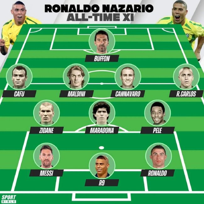 巴西传奇前锋罗纳尔多最近公布了他心中的最佳11人阵容。在这份阵容中,门将是意大利的布冯,后卫包括来自巴西的卡福、意大利的马尔蒂尼、卡纳瓦罗以及另一位来自巴西的罗伯特-卡洛斯。中场位置则由法国的齐达内、阿根廷的马拉多纳和巴西的贝利组成。而前锋线上除了罗纳尔多本人外,还有梅西和C罗入选。这支阵容汇集了足坛历史上许多传奇球星,堪称实力雄厚。