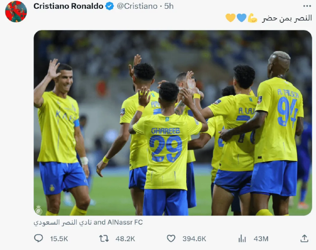 利雅得胜利2-1逆转利雅得新月夺冠。C罗在这场比赛中打进了两球,帮助球队拿下了阿拉冠冠军。随后,C罗通过社交媒体更新了自己的状态,晒出了庆祝照片并发文。他用阿拉伯文写道:“胜利属于在场的每一个人”。