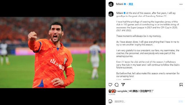 山东泰山俱乐部宣布比利时外援费莱尼将在本赛季结束后离队。费莱尼随后在个人社交平台发文,表达了对俱乐部的情感和回顾了他在这里的五年时光。