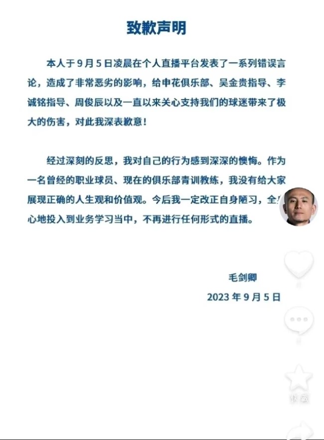 毛剑卿在个人社媒上发表了一份致歉声明,针对他之前的错误言论表示道歉,并且承诺以后不会再进行任何形式的直播。在这次声明中,他承认自己的错误言论给申花俱乐部、吴金贵指导、李诚铭指导、周俊辰以及一直以来关心支持他们的球迷造成了极大的伤害,并对此深表歉意。