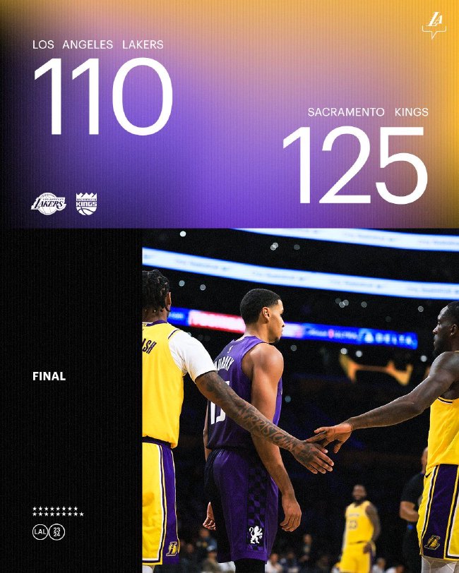 湖人队在昨天的比赛中大胜灰熊,但由于今天是连续两天比赛,他们似乎没有找到状态。在比赛开始的第一节,湖人队连续出现失误,使得国王队很快取得了20分的领先优势。不过,詹姆斯和拉塞尔带领球队奋力追分,在下半场结束时,国王队依然保持13分的领先优势。第三节,国王队再次扩大了分差,将领先优势拉大到20分以上。虽然湖人队在末节比赛中曾一度将分差追至个位数,但国王队及时稳住局面,最终以125-110战胜湖人队。
