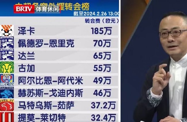 2月27日消息,BRTV体育休闲频道的节目《足球100分》列出了新赛季中超冬窗外援转会费的排名。泰山队的外援泽卡以185万欧元的转会身价,位居本次冬窗中超转会费榜的首位。其余排名如下: