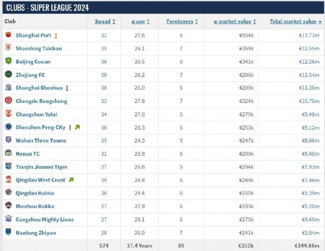 新赛季中超联赛即将于3月1日揭幕,目前各队的总身价排名已经揭晓。上海海港以1773万欧的身价居首,紧随其后的是山东泰山和北京国安,分别为1255万欧和1228万欧。在具体数据方面,上海海港平均年龄为27.6岁,拥有6名外援;山东泰山平均年龄28.1岁,有7名外援;而北京国安则平均年龄26.5岁,有6名外援。其他球队的情况也都有所不同,其中青岛海牛以539万欧的总身价排在倒数第二位,而南通支云则以394万欧排在最后一位。这些数据为球迷们提供了对各支球队实力与配置的一个概览,让人们对新赛季的中超联赛充满期待。